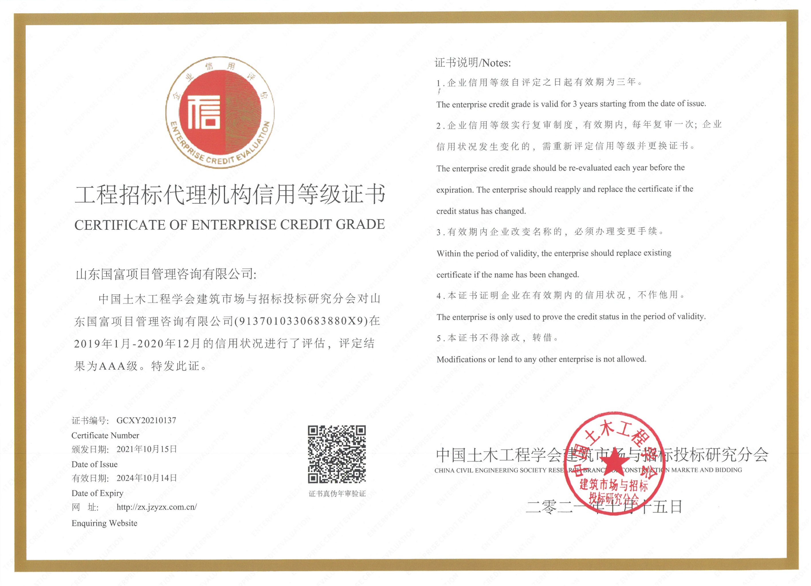 山東國富榮獲“工程招標代理機構企業信用等級評價AAA級”